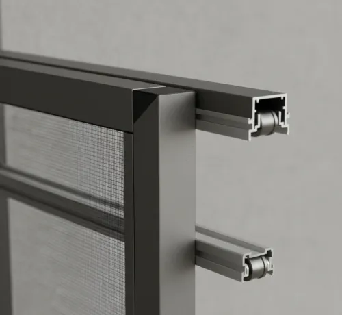 Обычный рамочный экран ограничивает функциональность сдвижных оконных створок и не выдерживает аэродинамических нагрузок на больших площадях. Жесткая интеграция рельс в существующую оконную раму позволяет защитному экрану свободно перемещаться параллельно стеклу.